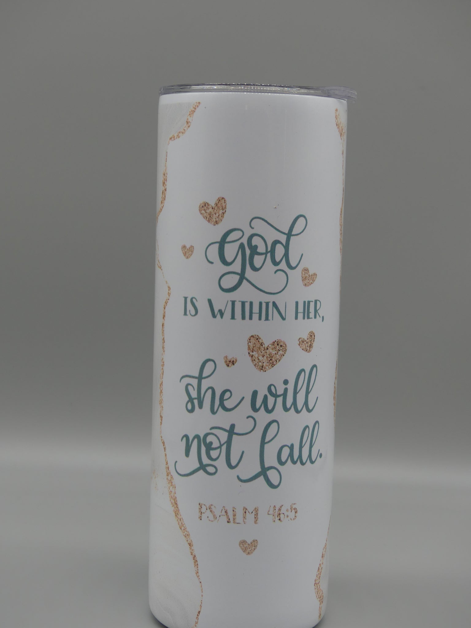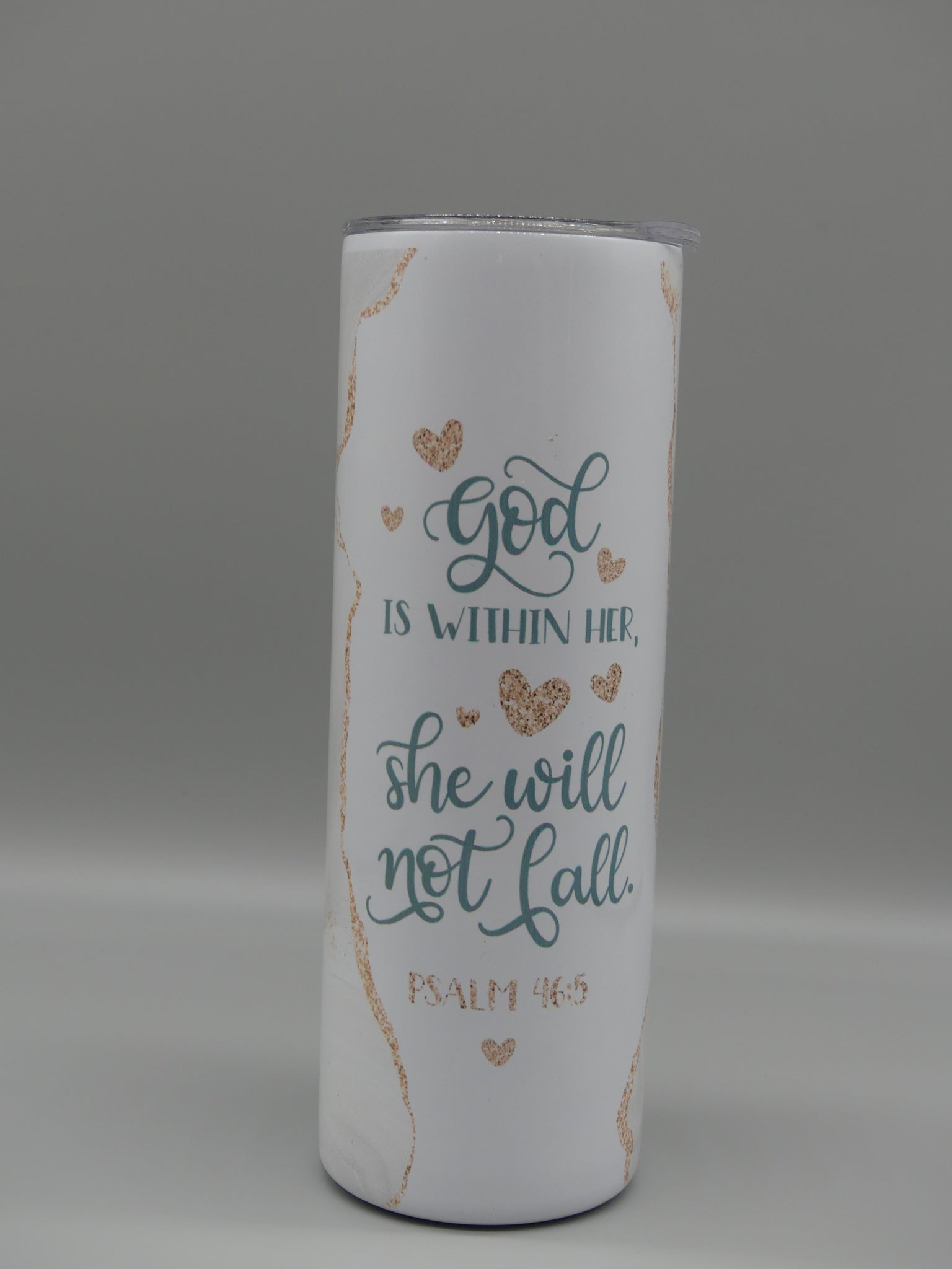 The following product is a 20oz double walled skinny tumbler decorated with the following design. It comes with a clear top. Hand washing safe, BPA and lead free. Suitable for both cold and hot drinks.