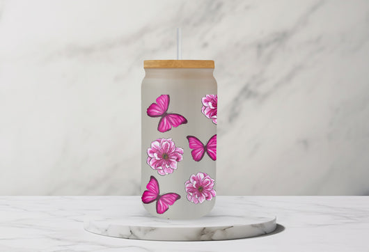 The following product is a 16oz Libbey drinking glass decorated with the following design. It comes with a bamboo top and and glass drinking straw. Hand washing safe, BPA and lead free. Suitable for both cold and hot drinks.