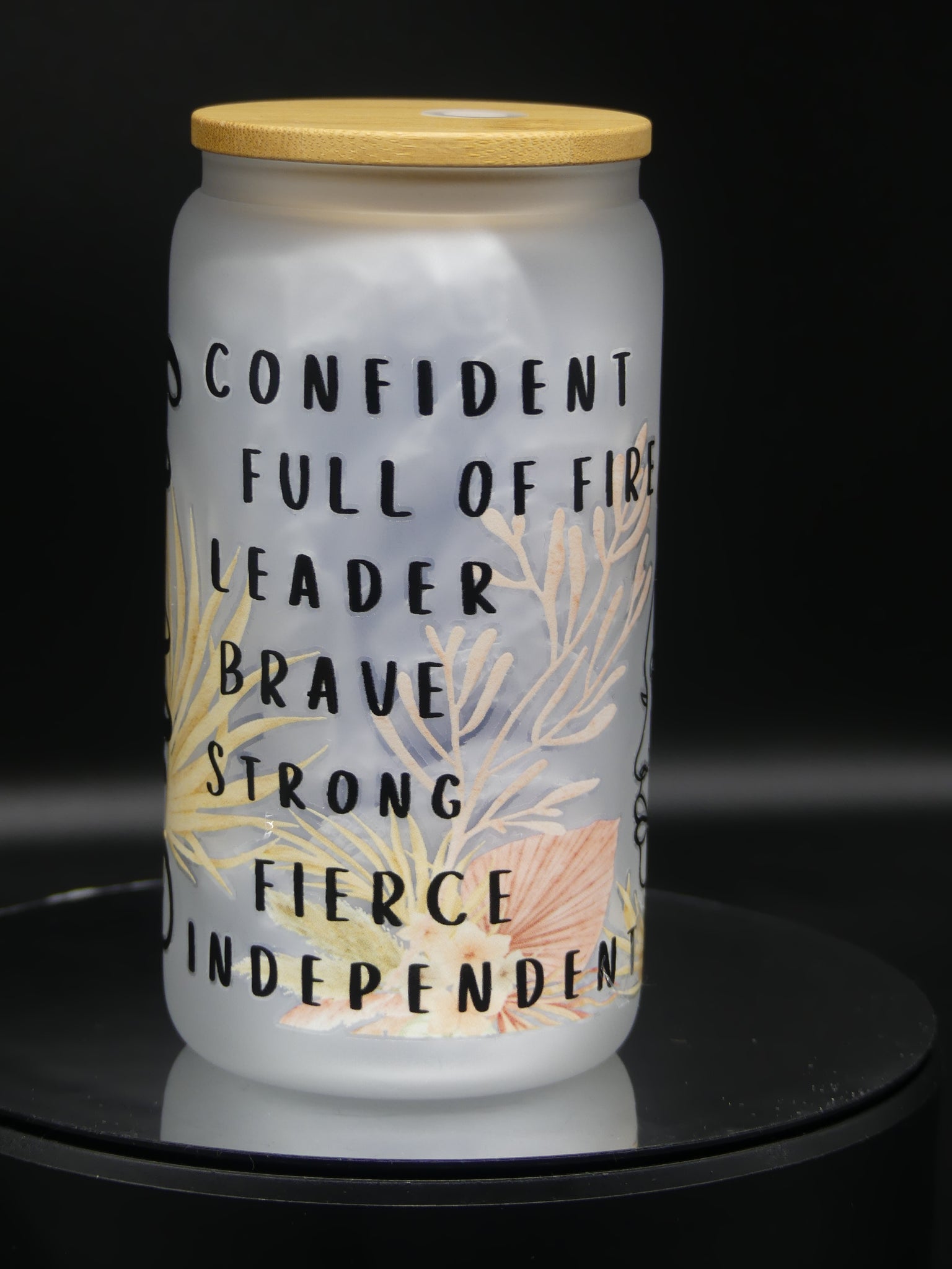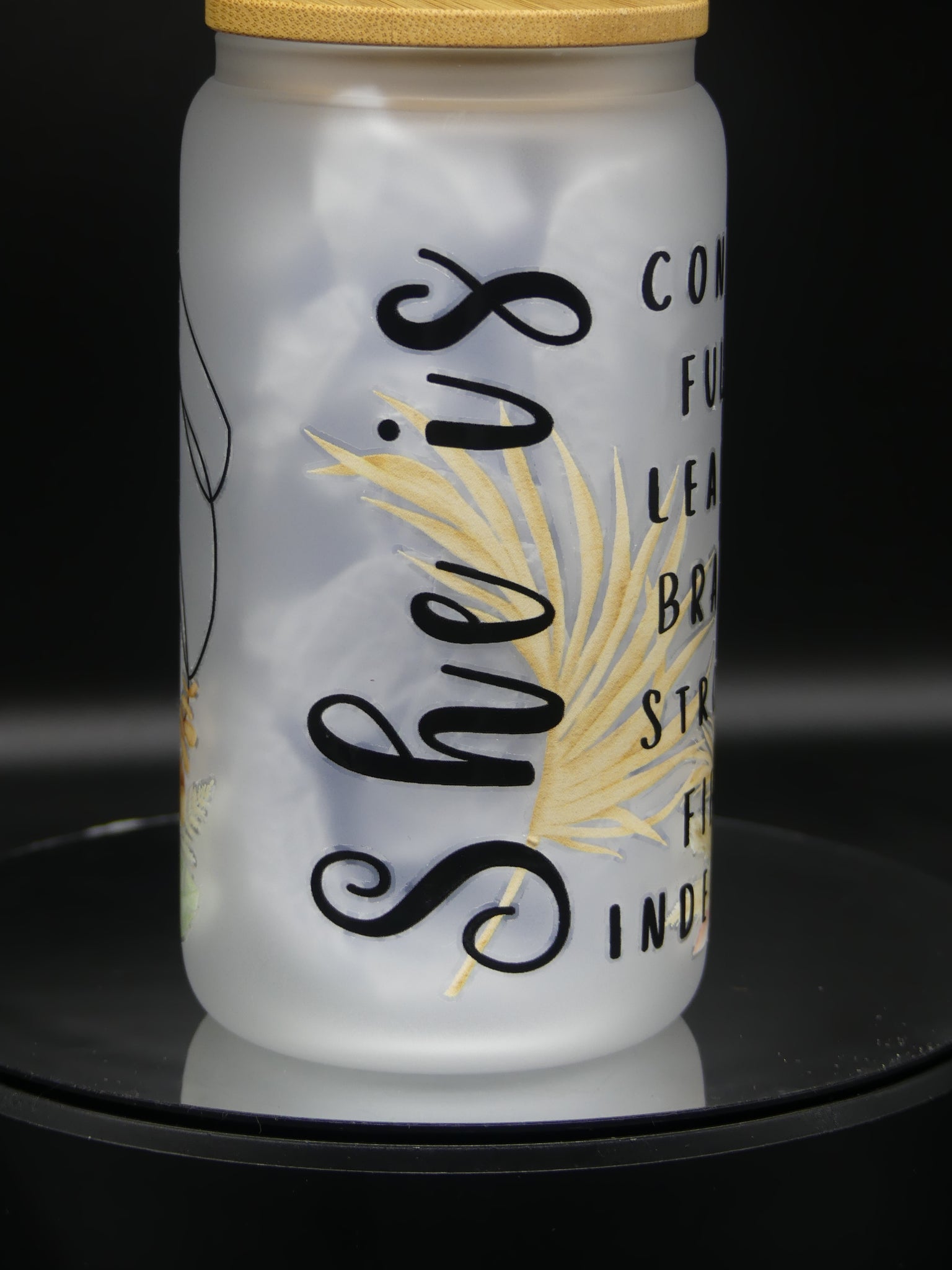 The following product is a 16oz Libbey drinking glass decorated with the following design. It comes with a bamboo top and and glass drinking straw. Hand washing safe, BPA and lead free. Suitable for both cold and hot drinks.